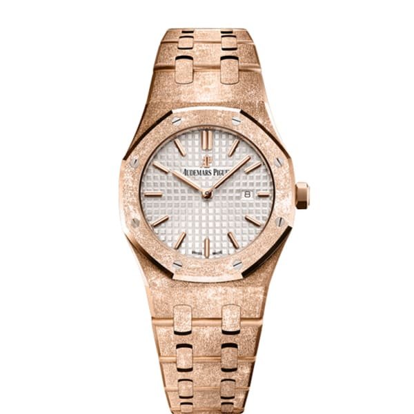 Audemars Piguet Royal Oak Quartz Silver dial, 33mm, 18k Rose gold, 67653OR.GG.1263OR.01Made of hammered 18K Rose gold and providing 50m water resistance, the 33mm case is fitted with glareproofed sapphire crystal and mounted onto a matching hammered 18K rose gold bracelet with AP folding clasp. The 2713 quartz caliber with seven jewels operates the central luminescent rose gold Royal Oak hands which indicate hours and minutes upon the Silver toned “Grande Tapisserie” dial with luminescent Rose gold applied hour-markers which also shows date in a window at the three o’clock position.
