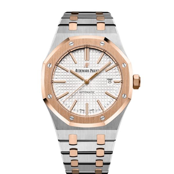 Audemars Piguet Royal Oak Selfwinding Silver dial, 41mm, Steel and 18k Rose gold, 15400SR.OO.1220SR.01. 41.00mm stainless steel case, 9.80mm thick, glareproof sapphire back, scre-locked 18K rose gold crown, 18K rose gold bezel, glareproofed sapphire crystal, silver-toned dial with “grande tapisserie” pattern, rose gold applied hour-markers, Royal Oak hands with luminescent coating, Caliber 3120 self-winding movement with hours, minutes, center seconds, date, approximately 60 hours of power reserve, stainless steel and 18K rose gold bracelet, AP folding buckle. Water resistant to 50 meters.