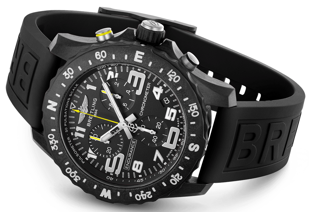 Breitling Watch Endurance Pro Black X82310E51B1S1. Designed to be both a lightweight watch for athletes and a casual, everyday sports chronograph, the Endurance Pro perfectly blends high precision & innovative technology with a vibrant & colourful design. It is the ultimate athleisure watch. Designed for men and women whose active lives blend a professional mindset with a sporty lifestyle, the Endurance Pro is equal to the challenges of a rigorous workout but fashionable enough for everyday wear. The Endurance Pro features an ultra light Breitlight case, a robust material 3.3 times lighter than titanium and 5.8 times lighter than stainless steel. Non-magnetic, thermally stable and hypoallergenic, Breitlight is highly resistant to scratches, traction and corrosion. It also has a touch that is warmer than metal and a slightly textured effect accentuating the originality of the design. Exclusive to Breitling, it is 100% Swiss made. Offered with a set of colourful dial and rubber straps fitting a Breitlight double tang type buckle, the Endurance Pro can also be paired with one of Breitling’s colourful Outerknown ECONYL yarn single piece strap. Powering the Endurance Pro is Breitling’s Caliber 82, a COSC certified SuperQuartz chronograph delivering exceptional precision.