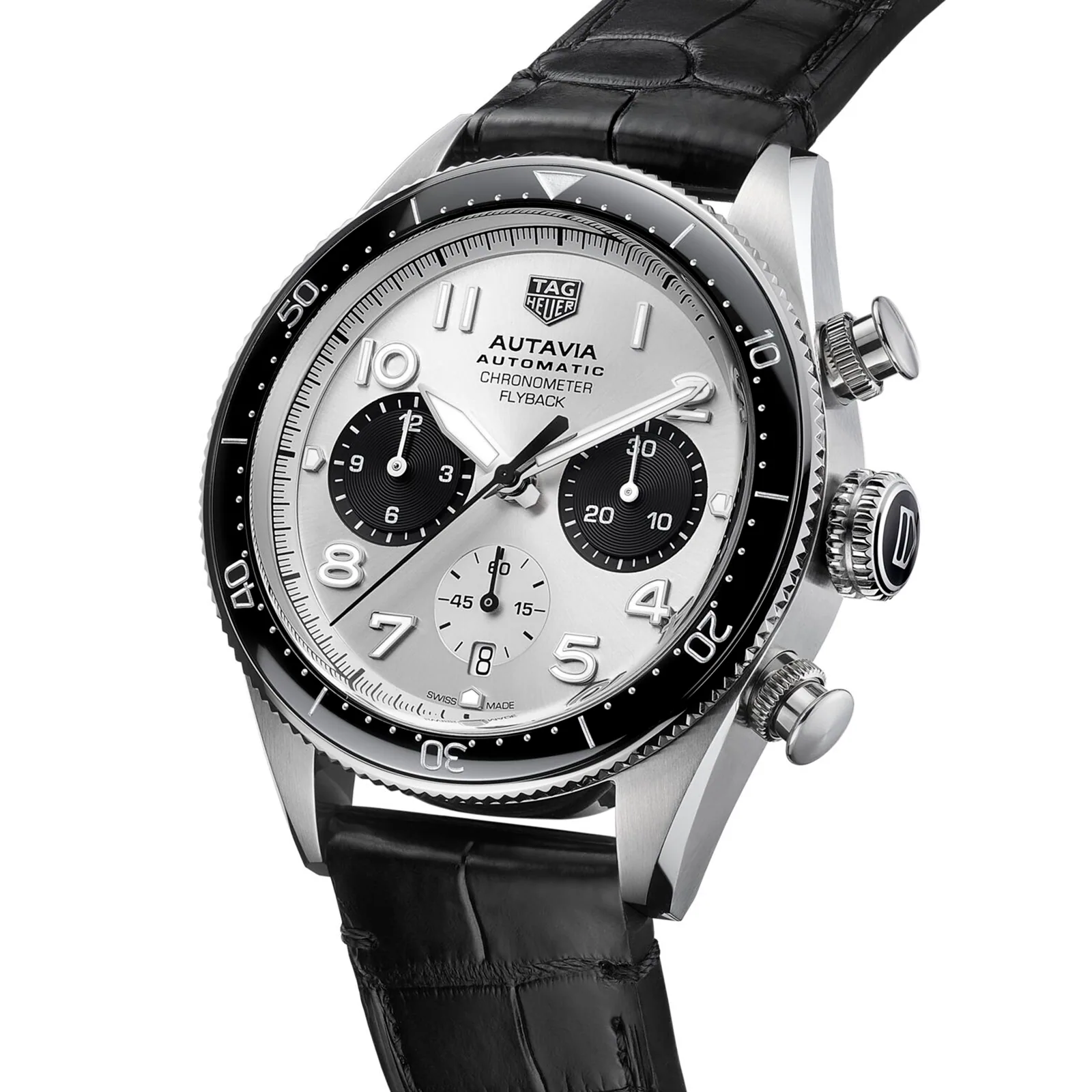 This Autavia Chronometer Flyback model is ready for any adventure, with a heroic silver dial with enhanced legibility, while the calibre 02 Flyback movement allows for the recording of laps via the rapid restarting of the timer function.