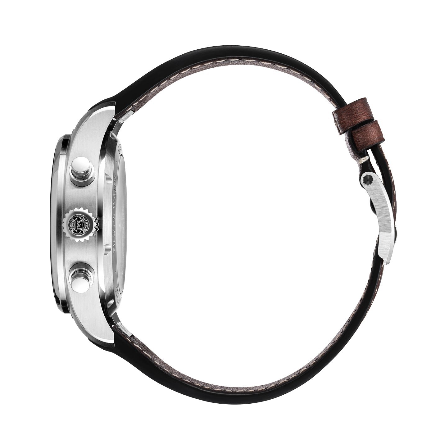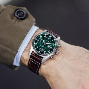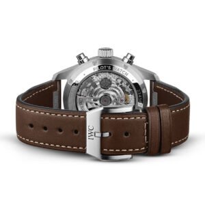 Highlights: The Pilot’s Watch Chronograph 41 (ref. IW388103) in an ergonomic 41mm case size is powered by the IWC-manufactured 69385 caliber. The robust and precise chronograph movement with a column wheel can be observed through the sapphire glass back. This stainless steel model comes with a green dial, rhodium-plated hands and a brown calfskin strap. The integrated EasX-CHANGE system allows the strap to be changed in no time at all. Available options are calfskin or rubber straps in various colors, and a high-quality stainless steel bracelet with fine adjustment clasp.