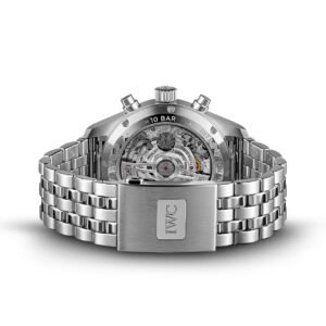 Highlights: The Pilot’s Watch Chronograph 41 in an ergonomic 41mm case size is powered by the IWC-manufactured 69385 caliber. The robust and precise chronograph movement with a column wheel can be observed through the sapphire glass back. This stainless steel model comes with a black dial, rhodium-plated hands and a high-quality stainless steel bracelet with fine adjustment clasp and a tapered shape.