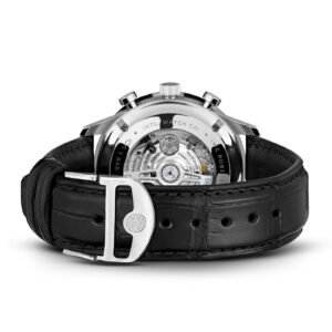 Highlights: The Portugieser Chronograph (IW371609) features a stainless steel case, a black dial, as well as rhodium-plated hands and appliqués; it is fitted with a black alligator leather strap. Inside the sporty-elegant chronograph, the IWC-manufactured 69355 caliber is at work. The robust and precise chronograph movement in classic column-wheel design is visible through a sapphire-glass case back.