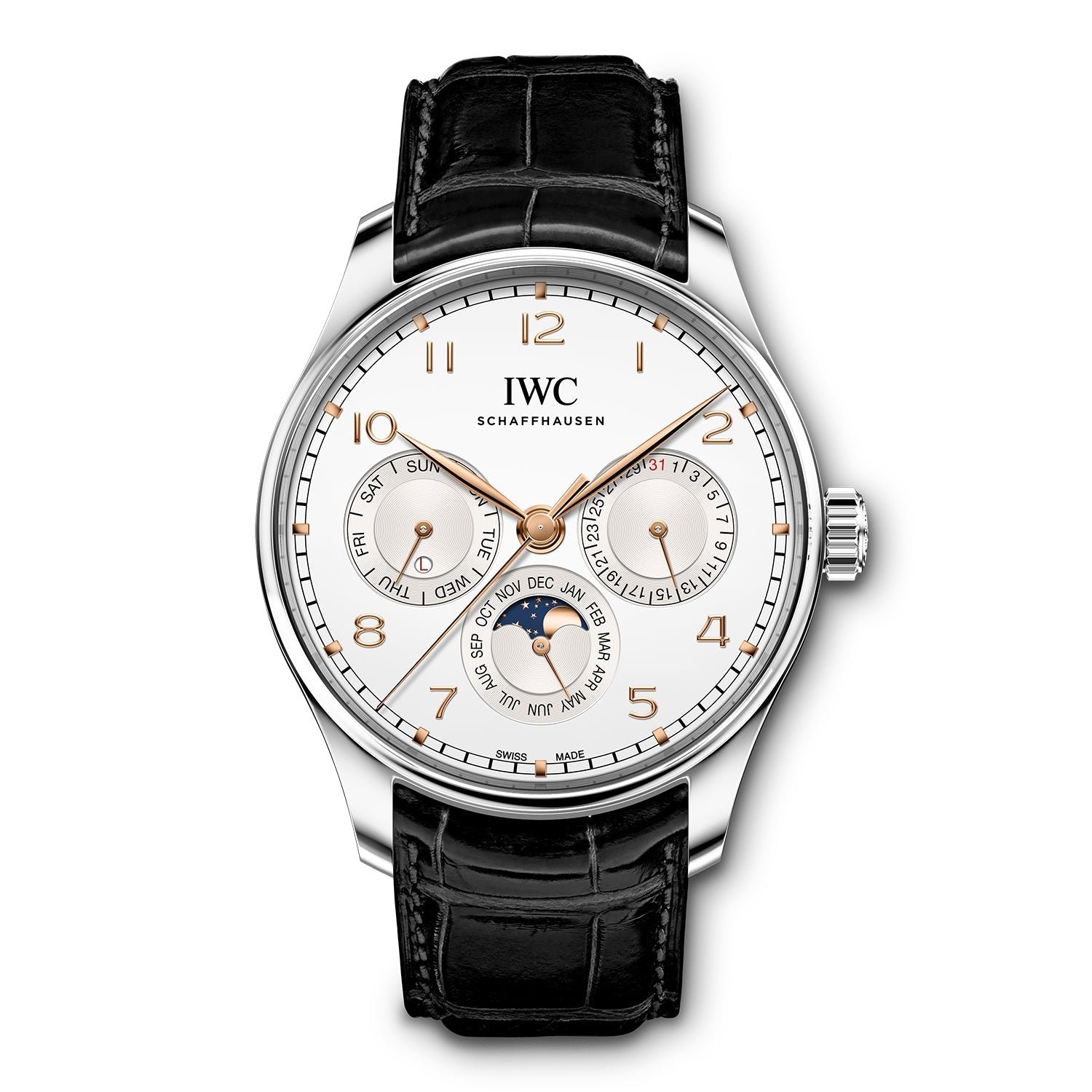 Highlights: The Portugieser Perpetual Calendar 42 (IW344203) displays the date, month and weekday on three subdials at “3 o’clock”, “6 o’clock” and “9 o’clock”. It also features indications for the moon phase and the leap year. With the help of ceramic components, the IWC-manufactured 82650 caliber’s Pellaton winding system builds up a power reserve of 60-hours. This timepiece with a diameter of 42mm has a stainless steel case, a silver-plated dial, and gold-plated hands and appliqués.