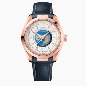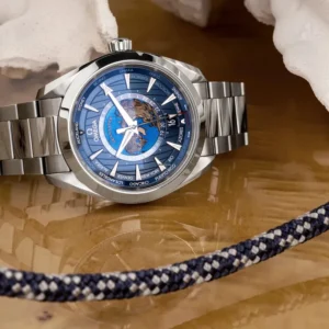 The exterior section of the dial is sun-brushed blue and includes vertical teak stripes and a circle of global destinations printed in red (GMT), silvery (+1h in summer) and blue (places without daylight savings).