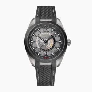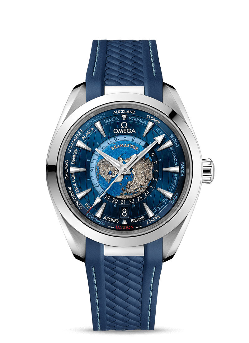 This 43 mm Worldtimer model includes a polished case in stainless steel which is integrated with the structured blue rubber strap via a solid polished link.