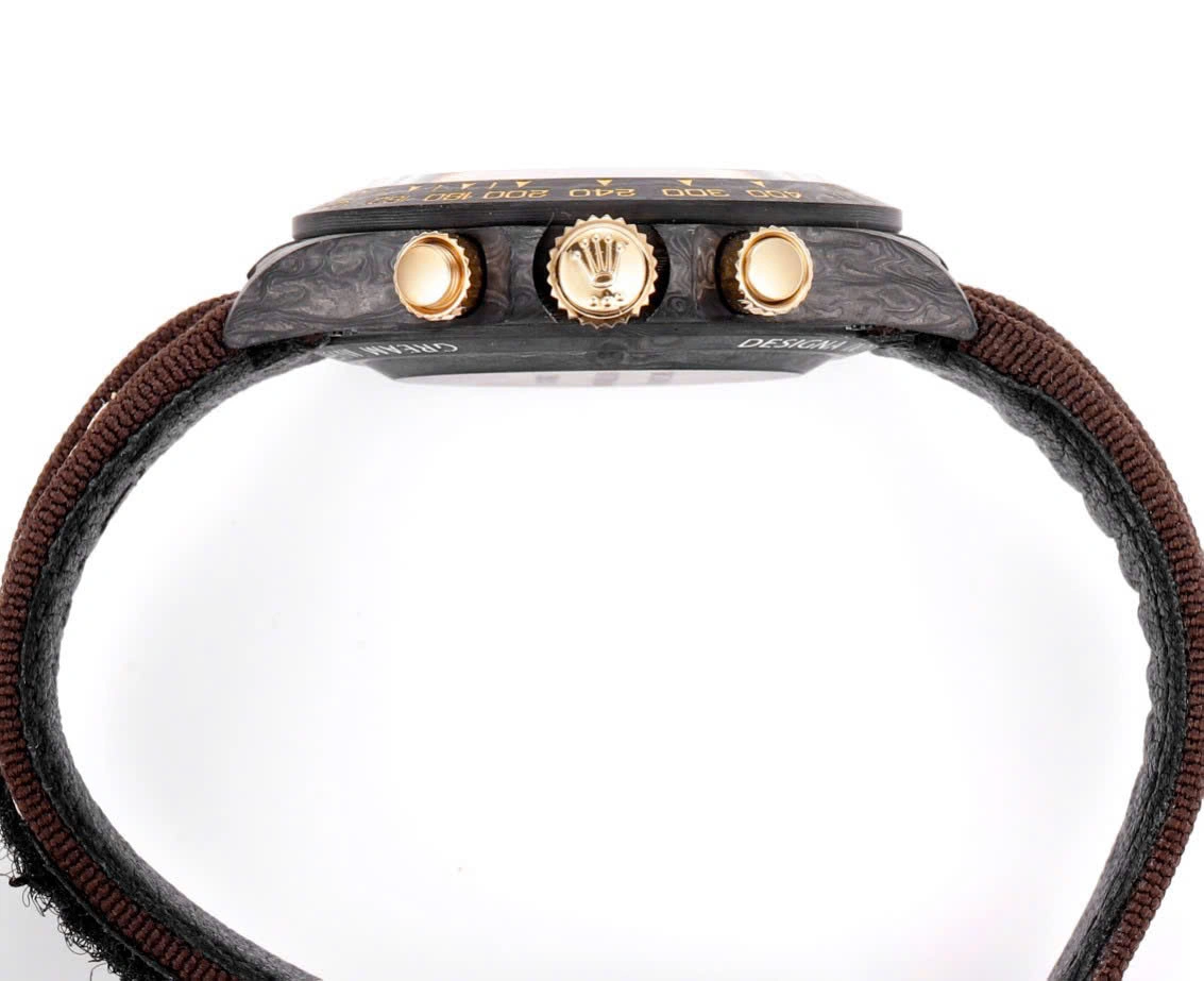 | CASE | – 40mm Oyster Case made of real Carbon Fiber – It is the Lightest Daytona ever produced with less than 50 grams of weight – Screw-Down Winding Crown – ROLEX ROLEX Laser Engraving on Rehaut Ring with Correct Alignment – Dimensions and Weight is Exact 1:1 Identical with Original |