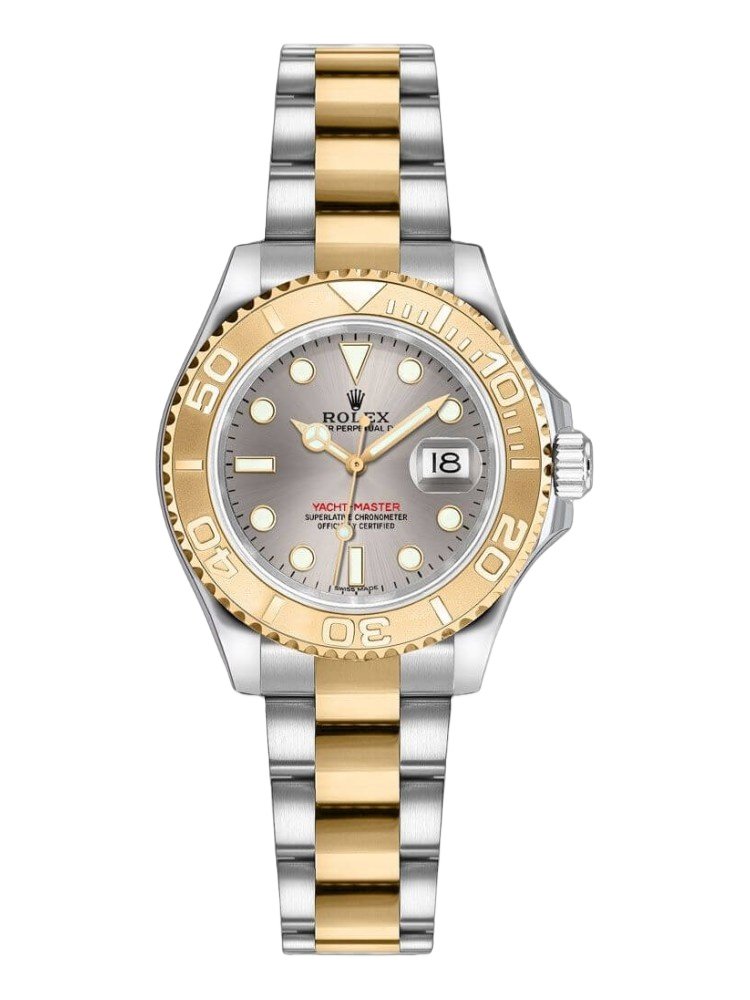Rolex Yacht-Master 169623 Two Tone 29MM Lady Replica Watch,Stainless steel and yellow gold case 29 mm in diameter.Yellow gold special time-lapse bidirectional rotating bezel. Scratch resistant sapphire crystal with cyclops magnifier.Grey dial with luminova baton, triangular and round hour markers. Date calendar at 3 o’clock aperture. Stainless steel and yellow gold oyster bracelet with flip-lock clasp.
