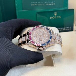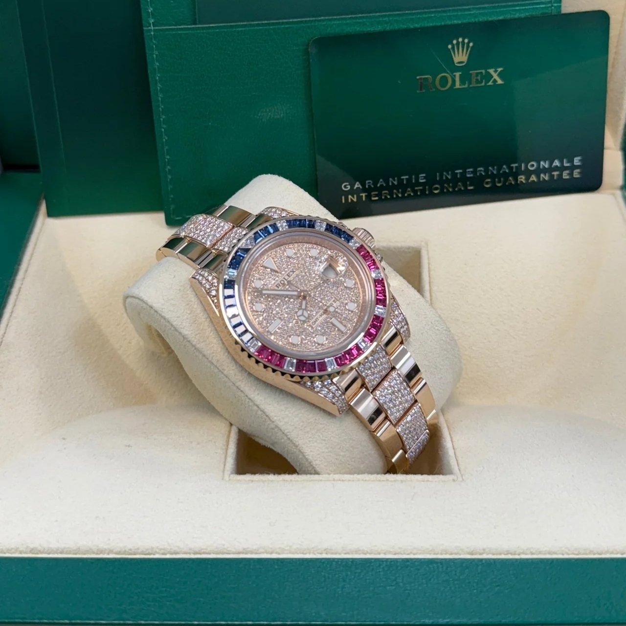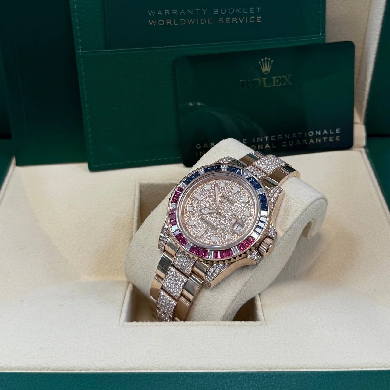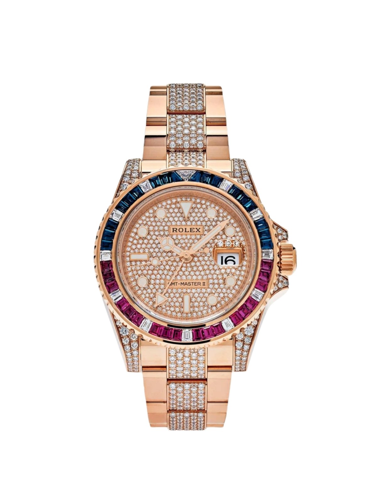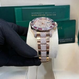 Rolex GMT Master II In Everose Gold with Rubies, Sapphires and Diamond Bezel, Pave Diamond Dial, And Pave Diamond Bezel. Reference Number 126755SARU