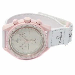 On this bold watch, the white VELCRO© strap perfectly offsets the powdery pastel pink. Oval subdials embellished with diamond-like details on the edges add a touch of feminine elegance. The hours, minutes, chronograph seconds hand and counter hands are also pink. All dials carry the OMEGA X SWATCH branding, as well as the iconic Speedmaster logo and the new MoonSwatch logo. The glass construction, the “hidden” S integrated in the center of the crystal, the fine and sophisticated circular pattern on the dial outer ring and the subdials, the sharp and smooth lugs construction, and of course the unique Bioceramic touch are common to all models and stand for passionate love for details. All hours, minutes, chronograph seconds hands and hour markers sport superluminova for a perfect glow in the dark.SO33P100