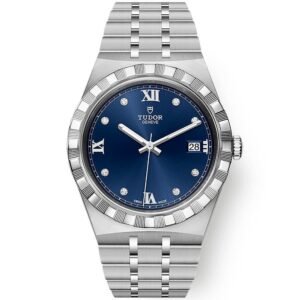 The versatile sport-chic watch from Tudor – the Royal. It Features a compact 38mm diameter crafted from stainless steel and a sapphire crystal glass top for protecting a blue dial with Roman numeral hour markers and diamond dot indexes. This classic yet universally appealing watch Features luminous central hour and minute hands together with a useful date aperture to keep on track of the passing days of each month with. The model is 200-meter water resistant and powered by a self-winding movement – the Calibre T601, which provides a 38-hour power reserve. The Tudor Royal watch series is well-known for several hallmarks. A notched bezel Features on the watch, with grooved edges executed in a mix of brushed and polished finishes. Similarly, the five-link stainless steel bracelet, which attaches this Tudor Royal watch to the wrist is recognisable for its external and central links in a satin-brushed effect and intermediate polished links that secure with a folding clasp.